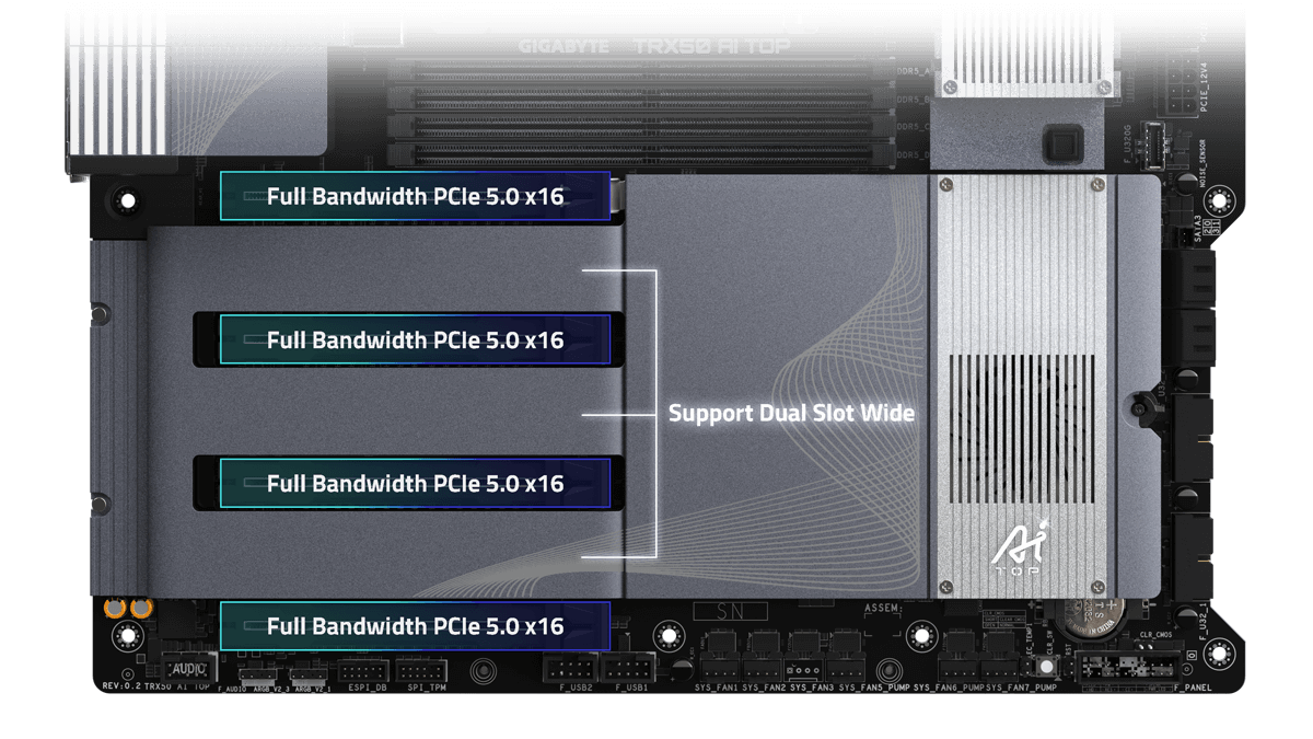 Mainboard TRX50 cung cấp 3 khe PCIe x16, trong đó có 2 khe PCIe 5.0 và 1 khe PCIe 4.0, hỗ trợ đa card đồ họa (AMD CrossFire) hoặc các card tăng tốc AI chuyên dụng.