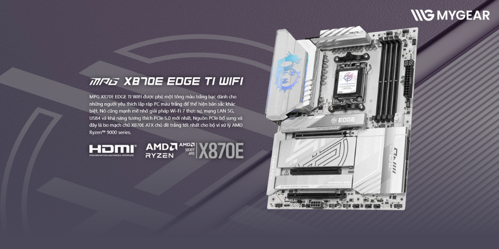 Mainboard MSI MPG X870E EDGE TI WIFI DDR5 là lựa chọn hàng đầu cho những ai muốn sở hữu một bo mạch chủ AMD X870E mạnh mẽ, hiện đại và thẩm mỹ cao. Với hỗ trợ socket AM5, RAM DDR5, WiFi 7, PCIe Gen5 và thiết kế trắng bạc sang trọng, đây là bo mạch chủ lý tưởng cho cả game thủ, dân sáng tạo nội dung và những ai yêu thích build PC cao cấp.