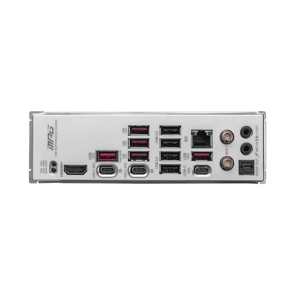 Điểm nhấn lớn nhất của mainboard MSI cao cấp này là thiết kế màu trắng bạc độc đáo, rất phù hợp với xu hướng build PC tông sáng, đặc biệt khi kết hợp cùng case, tản nhiệt và card màn hình màu trắng, mang đến một bộ PC cao cấp, tinh tế và đậm chất cá nhân hóa.