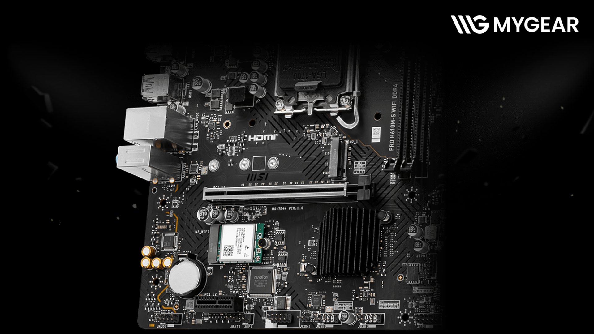 Điểm khác biệt lớn của mainboard H610 WiFi là kết nối không dây Wi-Fi 6E hỗ trợ băng tần 2.4GHz 5GHz và 6GHz, mang lại tốc độ cao hơn, độ trễ thấp và khả năng kết nối ổn định trong môi trường nhiều thiết bị. Đi kèm là Bluetooth 5.3, thuận tiện khi kết nối tai nghe, chuột, bàn phím và các thiết bị ngoại vi không dây. Với WIFI 6E motherboard như MSI PRO H610M-S WIFI DDR4, người dùng có thể lắp máy ở bất kỳ vị trí nào mà không cần kéo dây mạng phức tạp.