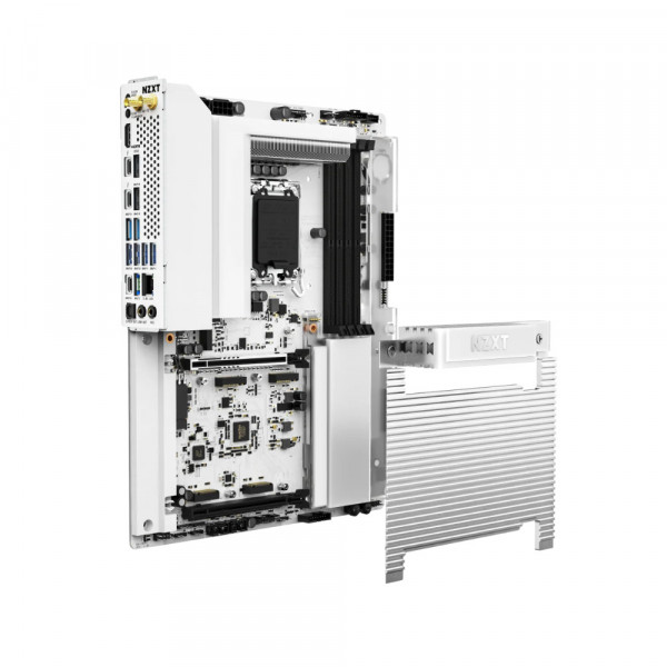 Bo mạch chủ NZXT Z890 trắng sở hữu phong cách thiết kế tinh tế, đặc trưng với tone màu trắng bạc cao cấp và tấm che linh kiện đồng bộ. Kết cấu PCB chắc chắn, kết hợp với hệ thống tản nhiệt nhôm phủ trắng, không chỉ mang lại vẻ đẹp hiện đại mà còn giúp tản nhiệt hiệu quả, đảm bảo hệ thống luôn vận hành mát mẻ.
