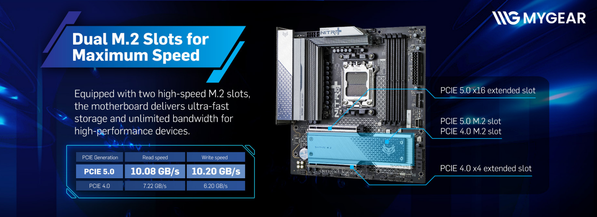 Bo mạch chủ Sapphire B850M được tích hợp khe PCIe 5.0 x16 cho card đồ họa rời, đảm bảo sẵn sàng cho GPU cao cấp trong tương lai. Ngoài ra, nhiều khe M.2 NVMe PCIe Gen5 giúp tận dụng SSD tốc độ siêu cao, hỗ trợ băng thông mạnh mẽ cho công việc nặng.