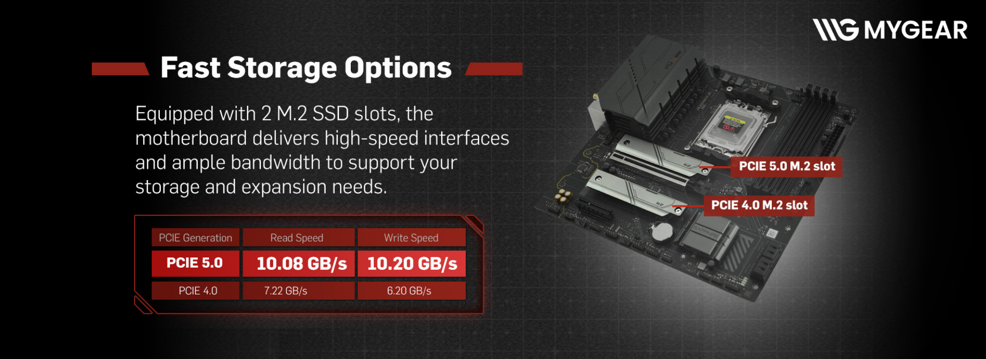 Pulse B850M WIFI DDR5 đi kèm khe PCIe 5.0 x16 cho card đồ họa và hỗ trợ khe M.2 PCIe Gen5 cho SSD siêu tốc, đồng thời cung cấp thêm các khe M.2 PCIe 4.0 và cổng SATA III, mang lại nhiều lựa chọn lưu trữ.