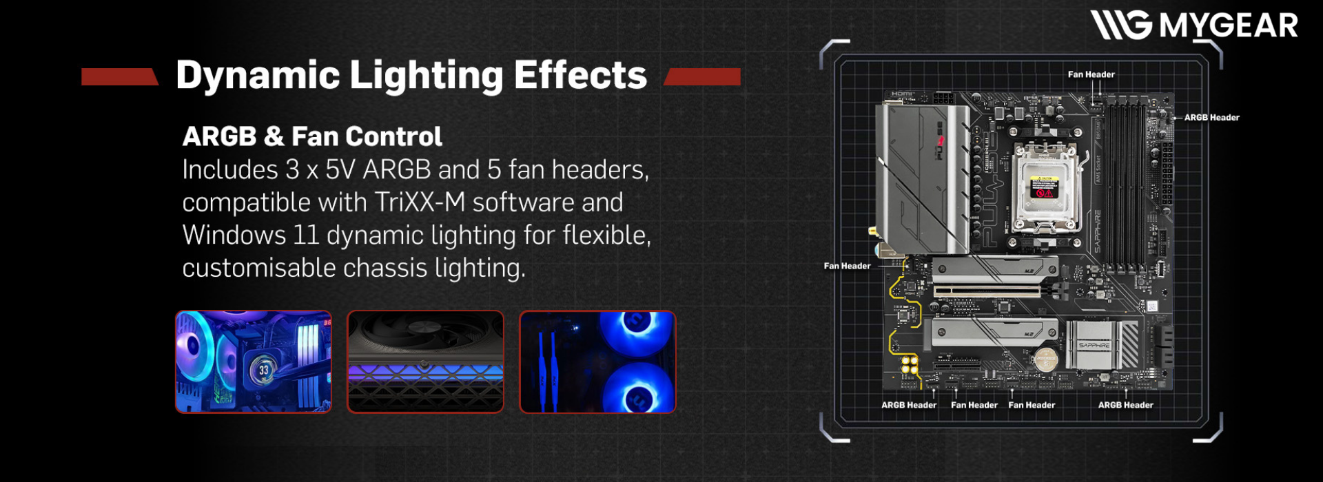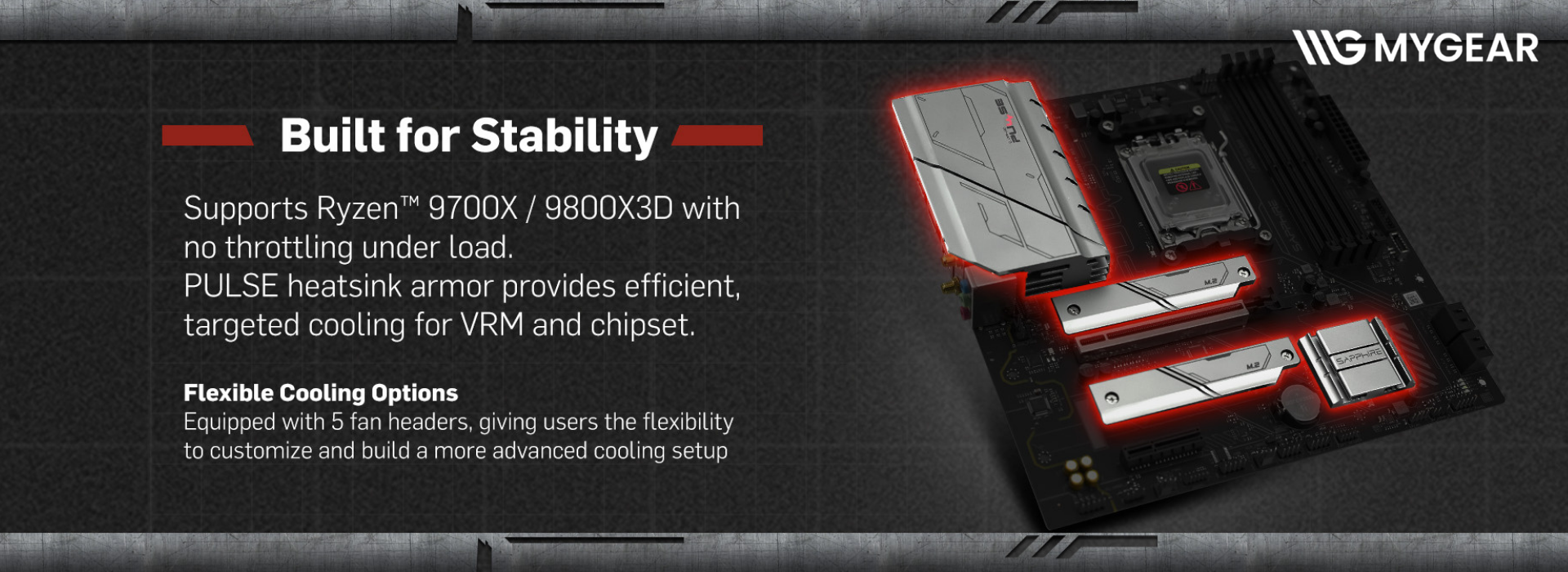 Mainboard Sapphire AM5 được trang bị heatsink VRM lớn cùng tấm tản nhiệt cho khe M.2, đảm bảo nhiệt độ luôn ổn định khi tải nặng. Điều này giúp tăng tuổi thọ linh kiện và giữ hiệu suất tối đa.