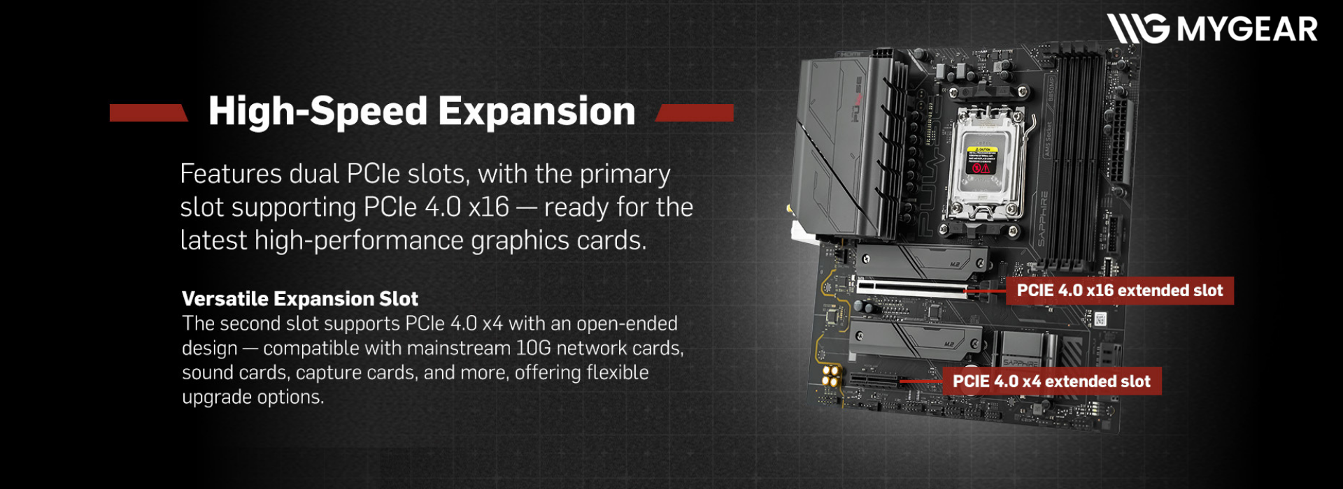 Được xây dựng trên nền tảng socket AM5, mainboard Sapphire AM5 hỗ trợ đầy đủ dòng CPU AMD Ryzen 7000, 8000 và 9000 series, mang lại hiệu năng mạnh mẽ, tối ưu hóa cho cả gaming lẫn xử lý đồ họa chuyên sâu.