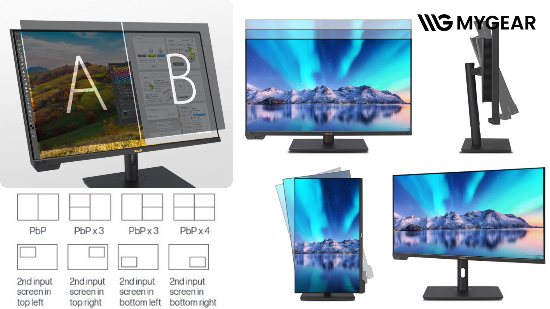 ASUS ProArt PA32KCX hỗ trợ đầy đủ các tùy chỉnh công thái học gồm nghiêng, xoay, pivot và nâng hạ độ cao 0–100 mm. Ngoài ra, các tính năng như Auto KVM, PbP/PiP, Light Sync với cảm biến ánh sáng và đèn nền giúp tối ưu trải nghiệm sử dụng trong môi trường làm việc chuyên nghiệp.