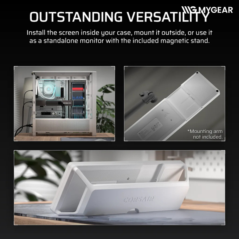 Corsair XENEON EDGE White hỗ trợ nhiều kiểu lắp đặt như gắn vào khung radiator 360mm, gắn nam châm, đặt trên chân đế hoặc sử dụng lỗ vít chuẩn 1/4-20 inch. Thiết kế linh hoạt giúp màn hình phụ Corsair 14.5 inch dễ dàng tích hợp vào nhiều kiểu case PC khác nhau.