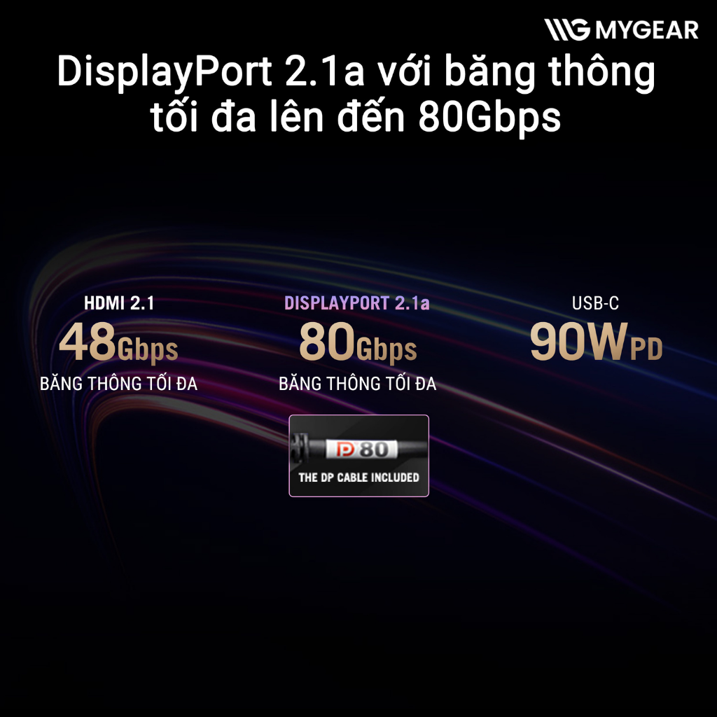 | Cổng kết nối | 1× DisplayPort 2.1, 2× HDMI 2.1 (FRL), 1× USB-C (DP Alt Mode), 3× USB 3.2 Gen1 Type-A, 1× Earphone Jack |
