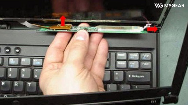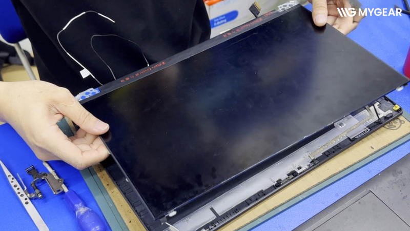 - Sau đó, mở nắp máy cẩn thận để kiểm tra cáp nối giữa mainboard và màn hình.
