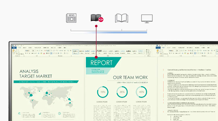 Màn hình LG 22MP400-B.ATV được tích hợp chế độ Đọc có thể điều chỉnh màu sắc và độ sáng tương tự như khi đọc trên giấy giúp dễ chịu hơn cho mắt và giảm mỏi mắt. Cùng với đó, chế độ Flicker-Free giúp bạn làm việc thoải mái trong thời gian dài bằng cách giảm thiểu hiện tượng nhấp nháy thường gặp trên màn hình.