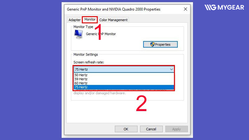 4. Chọn tab Monitor, tìm mục Screen refresh rate, chọn tần số quét phù hợp → nhấn Apply → OK.
