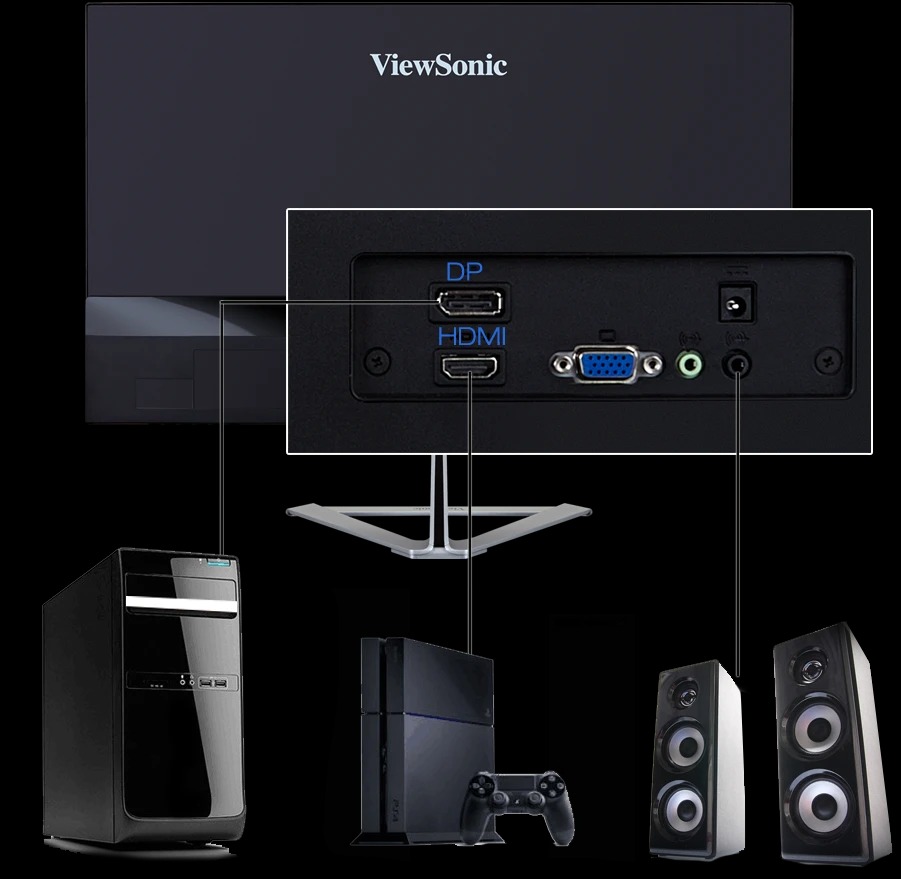 Màn hình ViewSonic VX2476-SMHD được trang bị các cổng kết nối đa dạng như HDMI và DisplayPort, giúp người dùng dễ dàng kết nối với các thiết bị khác nhau như máy tính, laptop, console game, hoặc đầu phát multimeida. Ngoài ra, tính năng FreeSync giúp điều chỉnh tần số làm mới của màn hình để phù hợp với khả năng hiển thị của card đồ hoạ.