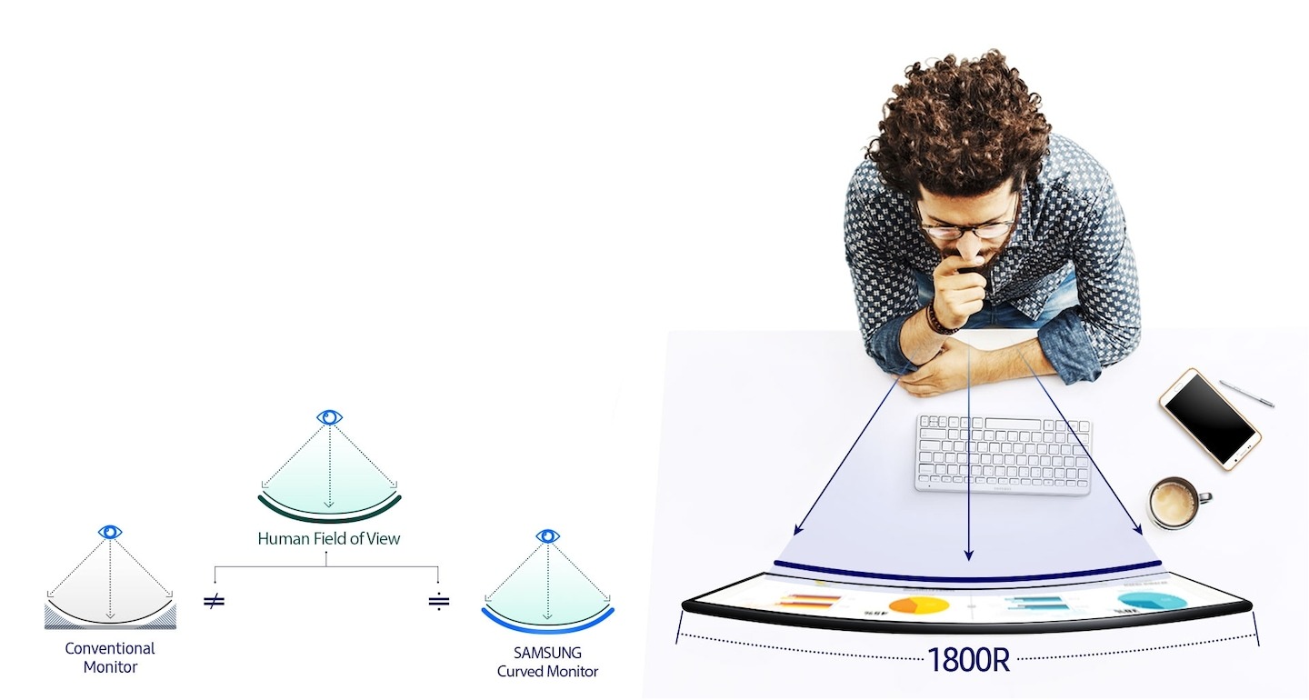Màn Hình Samsung Cong C27F390FHE có thiết kế cong độc đáo, tạo cảm giác bao quát hơn và hấp dẫn hơn so với màn hình phẳng truyền thống. Viền màn hình siêu mỏng giúp tối ưu hóa không gian hiển thị.