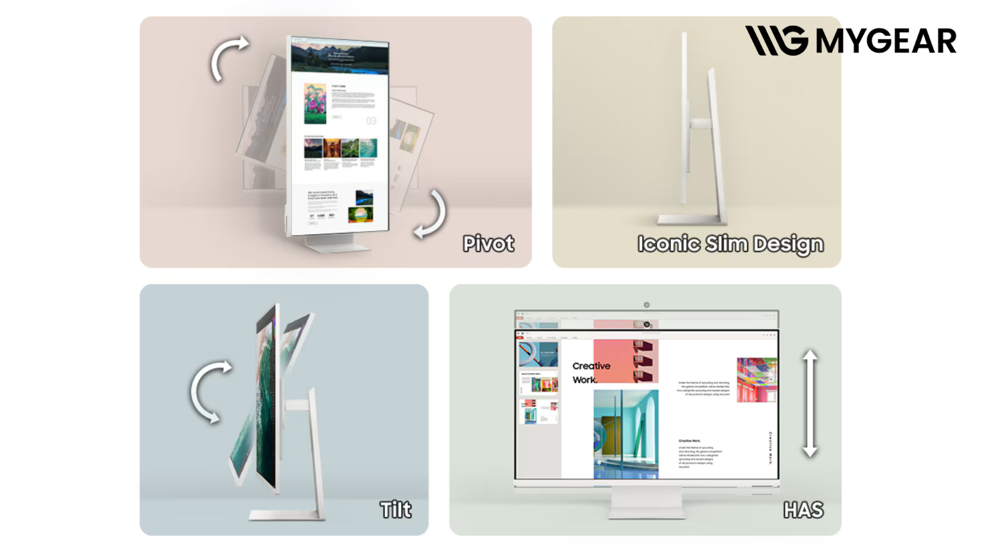 Samsung M8 M80F đi kèm chân đế công thái học cho phép điều chỉnh độ cao lên đến 120mm, nghiêng màn hình và xoay Pivot 90 độ. Ngoài ra màn hình cũng hỗ trợ chuẩn VESA 100 × 100 mm để gắn arm. Thiết kế công thái học giúp người dùng dễ dàng điều chỉnh vị trí màn hình để đạt tư thế làm việc thoải mái nhất.