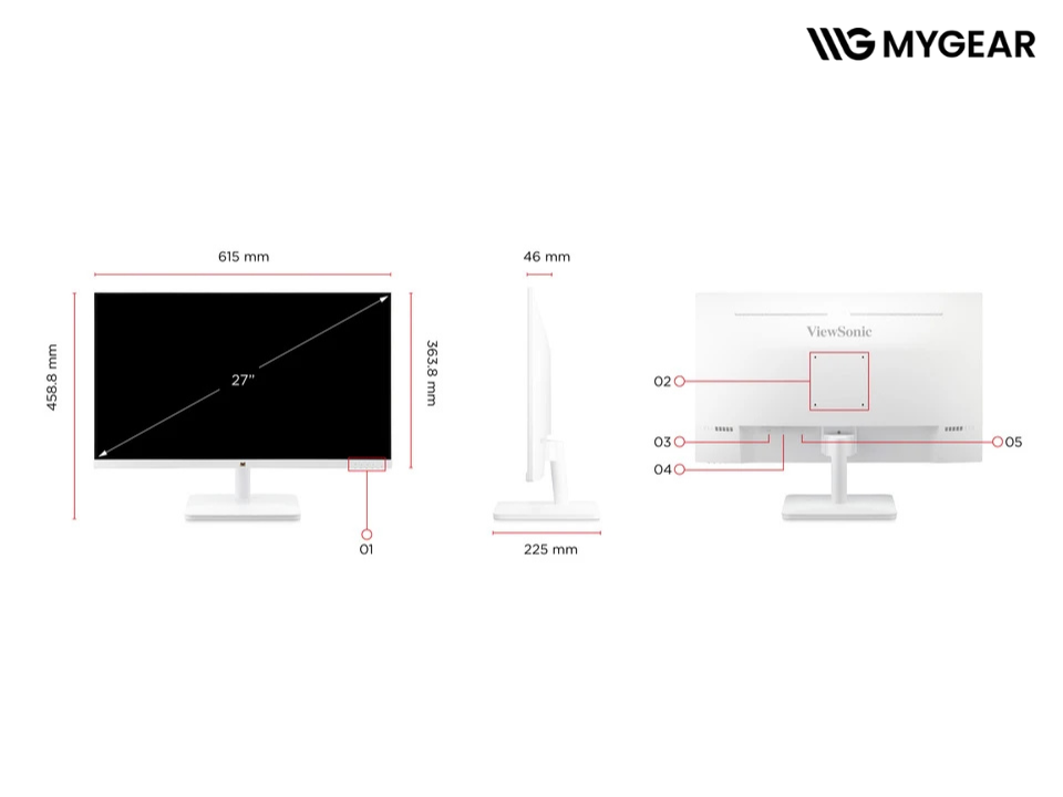 VA2732-H-W-2 ViewSonic sở hữu tông màu trắng tinh tế, giúp dễ dàng phối hợp với bàn làm việc sáng màu hoặc các bộ PC phong cách tối giản. Thiết kế màu trắng không chỉ mang tính thẩm mỹ mà còn giúp màn hình ViewSonic trắng trở nên nổi bật trong môi trường văn phòng hoặc góc học tập tại nhà. Kích thước tổng thể 615 x 458 x 225 mm với chân đế gọn gàng giúp màn hình văn phòng 27 inch không chiếm quá nhiều diện tích sử dụng.