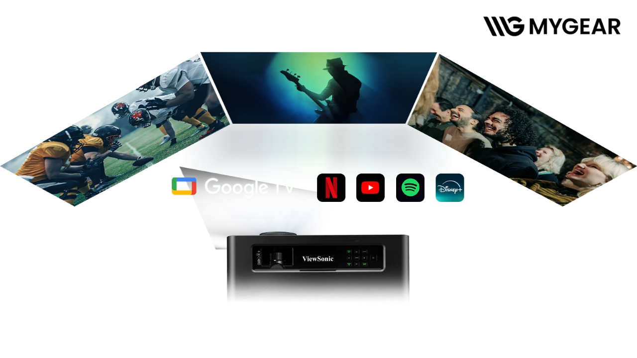Một điểm đặc biệt khiến máy chiếu ViewSonic X1-4K Pro vượt trội chính là Google TV tích hợp sẵn, cho phép bạn truy cập trực tiếp vào YouTube, Netflix, Disney+, Spotify và nhiều ứng dụng khác mà không cần thiết bị gắn ngoài. Bạn có thể điều khiển bằng giọng nói thông qua Google Assistant, tìm kiếm nội dung dễ dàng và cá nhân hóa trải nghiệm xem theo tài khoản Google của mình.