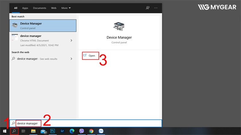 Nhập từ khóa Device Manager vào ô tìm kiếm trên thanh Start của Windows, sau đó nhấn Enter.