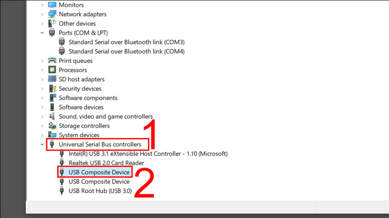 Bước 2: Mở mục Universal Serial Bus Controllers - Kéo xuống cuối danh sách và chọn mục USB.