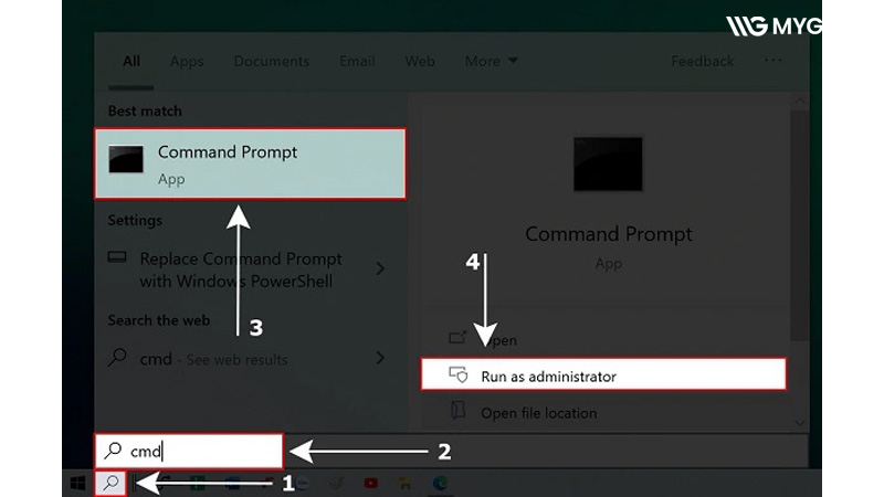 Nhấn phím Windows → gõ CMD → chuột phải vào Command Prompt → chọn “Run as administrator.”