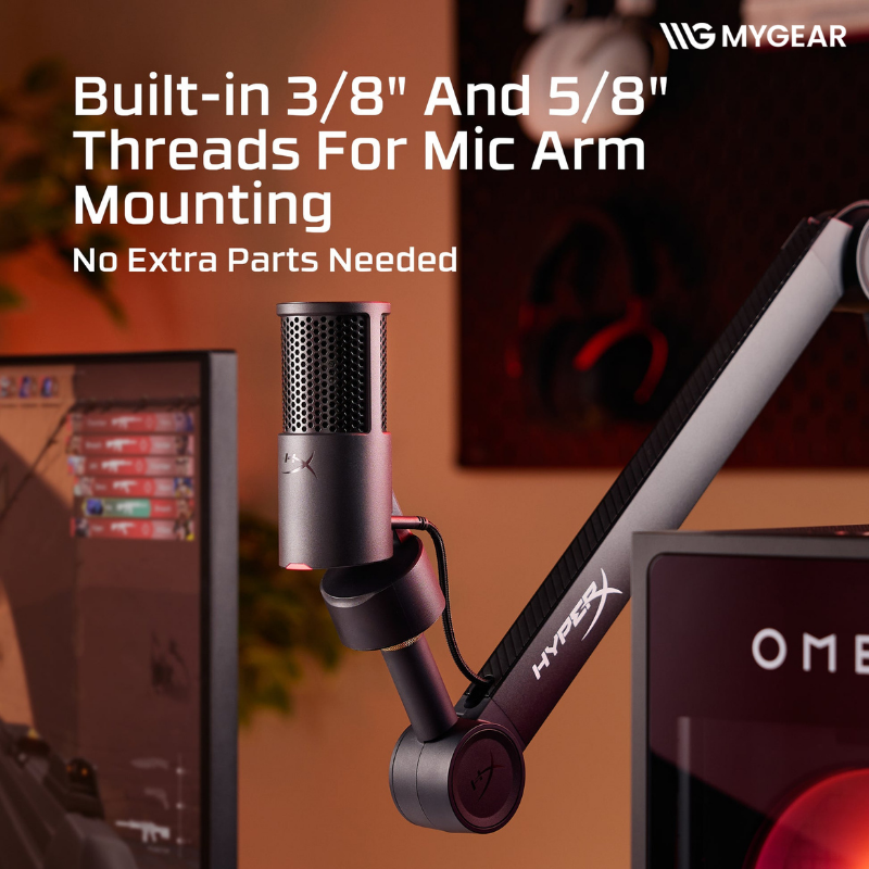 Micro có ren 3/8" & 5/8", tương thích với các tay mic phổ biến, giúp gắn lên chân micro hoặc boom arm dễ dàng. Tính năng giúp HyperX SoloCast 2 phù hợp với nhiều kiểu setup khác nhau, từ bàn làm việc đến studio mini.