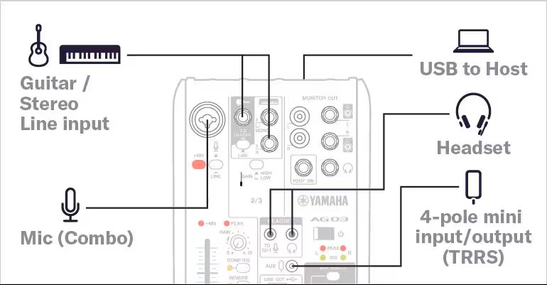 Yamaha AG03MK2 kết nối với máy tính hoặc điện thoại qua cổng USB-C tốc độ cao, tương thích với Windows, macOS, iOS và Android. Chức năng Loopback cho phép trộn âm thanh từ micro và nhạc nền cùng lúc để livestream, ghi âm hoặc gọi video mà không cần thêm thiết bị hỗ trợ.