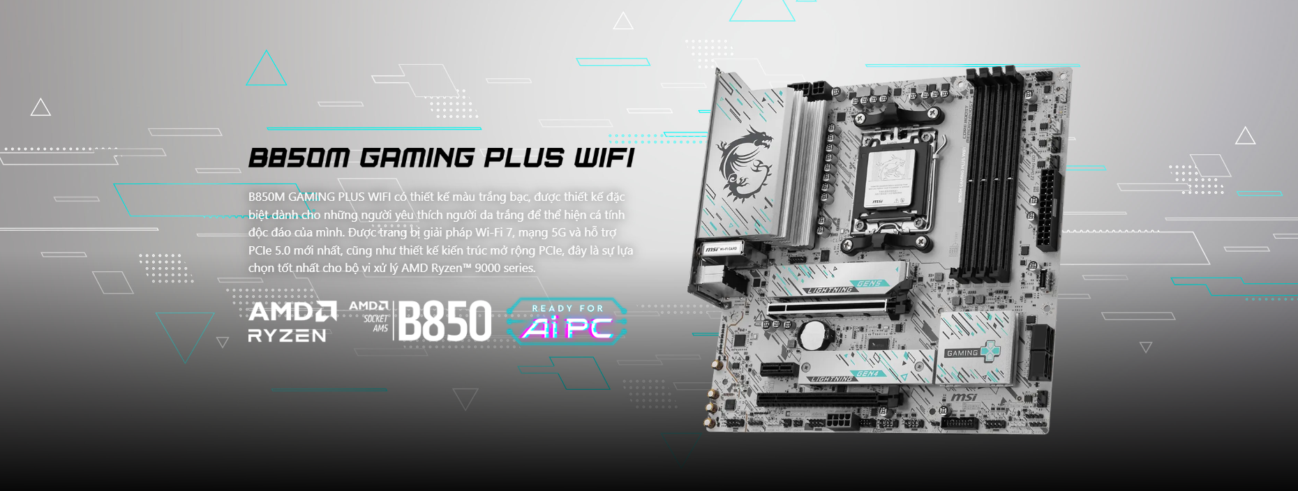 Mainboard MSI B850M GAMING PLUS WIFI DDR5 là bo mạch chủ chuẩn m-ATX được thiết kế dành riêng cho các game thủ và người dùng đòi hỏi hiệu năng cao trong một hệ thống gọn gàng. Dựa trên nền tảng chipset AMD B850, sản phẩm tương thích hoàn hảo với các dòng CPU AMD Ryzen™ 9000/8000/7000 Series, mang đến hiệu suất ổn định, khả năng nâng cấp mạnh mẽ và trải nghiệm sử dụng mượt mà.
