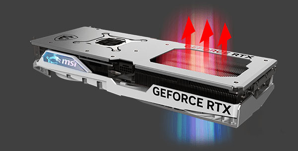 Nhiệt từ GPU và bộ nhớ VRAM ngay lập tức được hấp thụ bởi tấm đế bằng đồng mạ niken chắc chắn và sau đó nhanh chóng được truyền đến một dãy ống dẫn nhiệt. Việc mở rộng hệ thống truyền nhiệt với các cơ chế hiệu quả cao này giúp cải thiện hiệu suất tổng thể trên Card màn hình MSI GeForce RTX 4070 SUPER Gaming X Slim White 12GB GDDR6X.