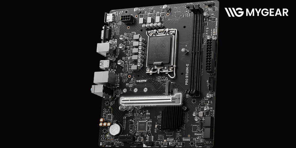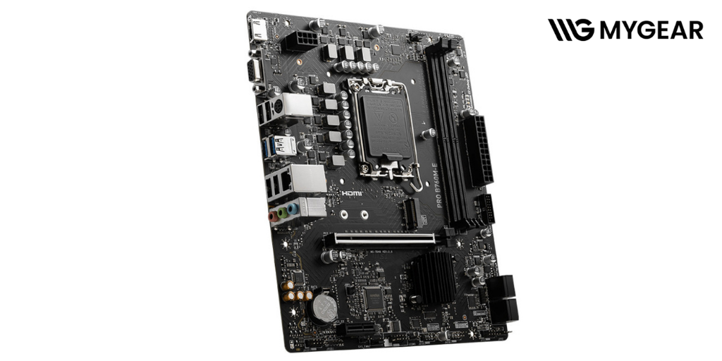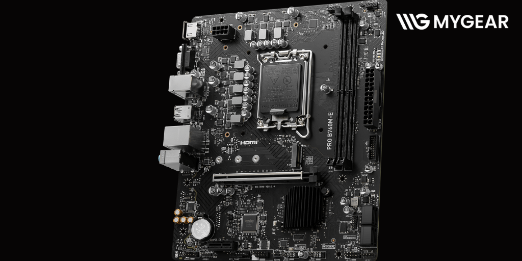 Với thiết kế mATX nhỏ gọn và hiện đại, Mainboard MSI Pro B760M-E không chỉ đẹp mắt mà còn tiết kiệm không gian trong thùng máy. Các linh kiện được sắp xếp hợp lý giúp dễ dàng thao tác lắp đặt và bảo trì.