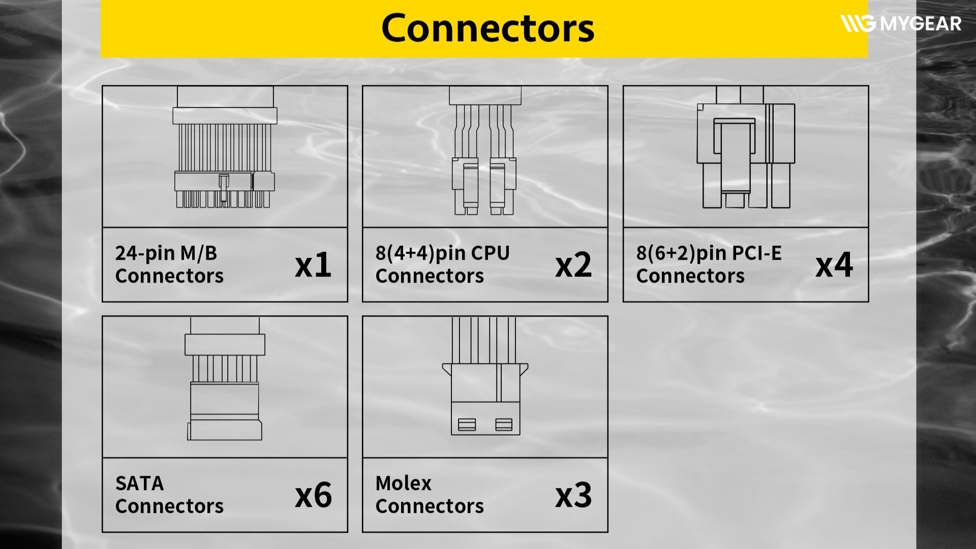 | Kết nối | 1 x MB 24 Pin, 2 x 8(4+4) Pin, 4 x 8(6+2) Pin PCI-E, 6 x SATA, 3 x Molex |