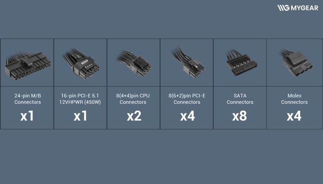 | Cổng kết nối | 1 x 24 (20+4) pin MB, 1 x 16 (12+4) pin PCIE 5.1 12VHPWR, 2 x 8 (4+4) pin CPU, 4 x 8 (6+2) pin PCI-E, 8 x SATA, 4 x Molex |