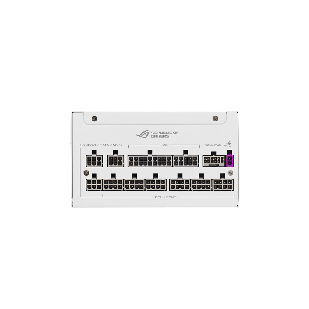 ASUS ROG Strix White PSU được trang bị nhiều cổng kết nối để hỗ trợ các cấu hình PC hiện đại. Bộ nguồn bao gồm đầu cấp nguồn 24-pin cho mainboard, hai đầu CPU 4+4-pin và nhiều đầu PCIe cho card đồ họa.