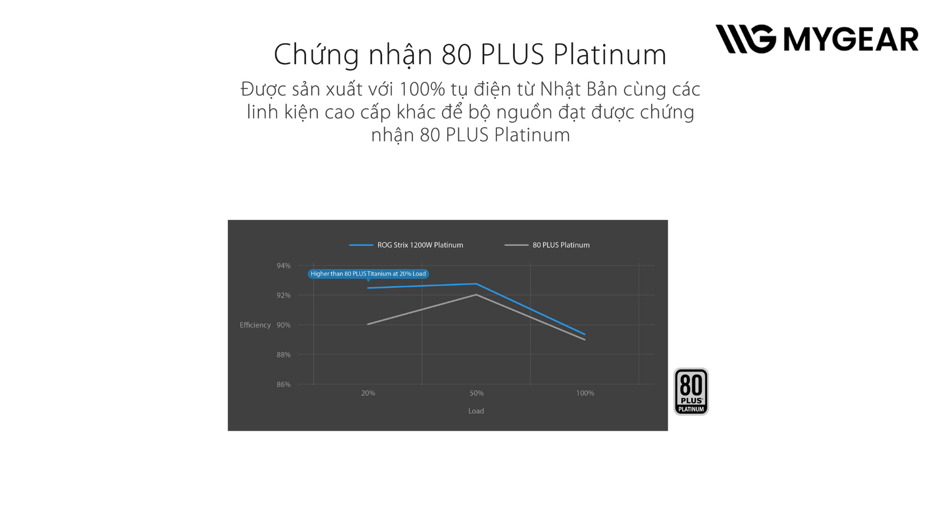 Nguồn ASUS ROG STRIX 1200W mang đến hiệu suất tối ưu với chứng nhận 80 PLUS Platinum, cho hiệu năng trên 92% ở mức tải tiêu chuẩn. Nhờ đó, điện năng được chuyển đổi hiệu quả, giảm tỏa nhiệt và giúp hệ thống hoạt động ổn định hơn, tiết kiệm điện năng rõ rệt cho người dùng.