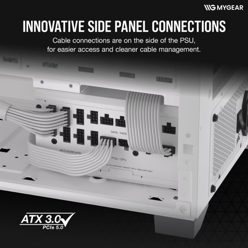 Với thiết kế nguồn Corsair full modular trắng, toàn bộ dây cáp có thể tháo rời, giúp người dùng dễ dàng lắp đặt và tối ưu hóa không gian bên trong case. Đặc biệt, phiên bản Shift có cổng cắm dây được đặt ở bên hông PSU thay vì phía sau, mang đến trải nghiệm gọn gàng và thuận tiện hơn khi đi dây.