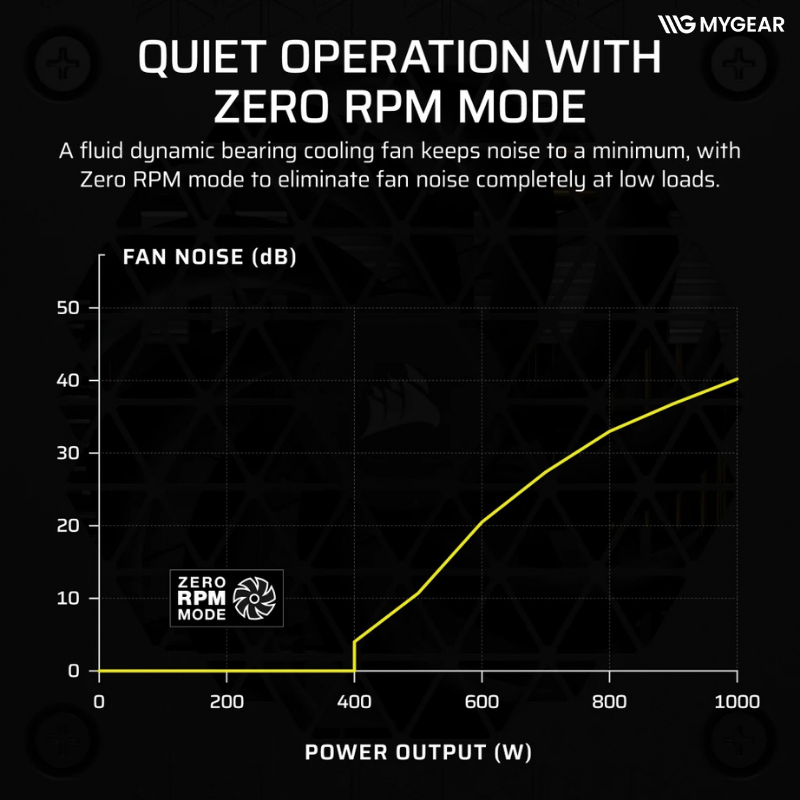 Corsair 1000W Platinum trang bị quạt 92mm chất lượng cao với chế độ Zero RPM Fan Mode, tắt hẳn quạt khi tải nhẹ để tạo sự yên tĩnh tuyệt đối. Khi tải nặng, quạt tự động kích hoạt để giữ nhiệt độ trong ngưỡng an toàn.