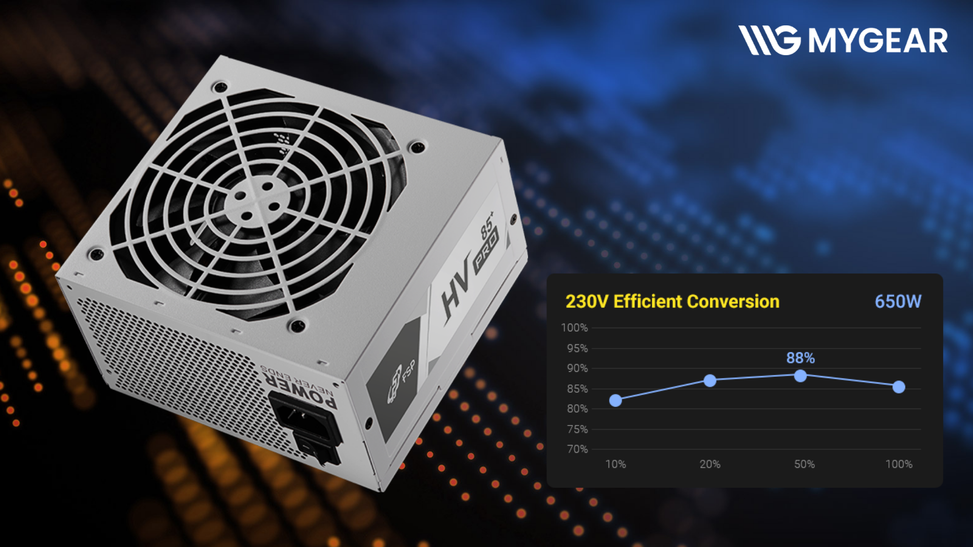 FSP HV PRO 85+ 650W White đạt chứng nhận 80 Plus 230V EU Bronze với hiệu suất ≥88% ở mức tải thông thường. Hiệu suất cao giúp giảm thất thoát điện năng, hạn chế nhiệt lượng tỏa ra và góp phần kéo dài tuổi thọ linh kiện bên trong nguồn.