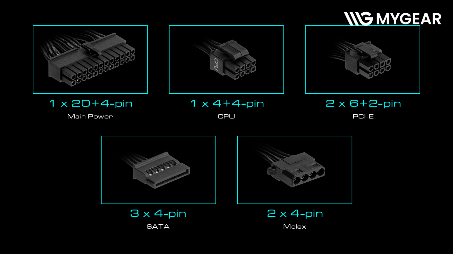 GAMDIAS AURA GP550 cung cấp các đầu kết nối cơ bản đáp ứng tốt nhu cầu sử dụng gồm 1 cổng 24 Pin cho mainboard, 1 cổng CPU 4+4 Pin, 2 cổng PCIe 6+2 Pin, 3 cổng SATA và 2 cổng Molex. Hệ thống cổng kết nối cho phép cấp điện ổn định cho mainboard, CPU, card đồ họa và các thiết bị lưu trữ trong cùng một cấu hình. Nhờ đó, nguồn phù hợp với các bộ PC văn phòng, học tập và gaming nhẹ cần số lượng kết nối vừa phải.