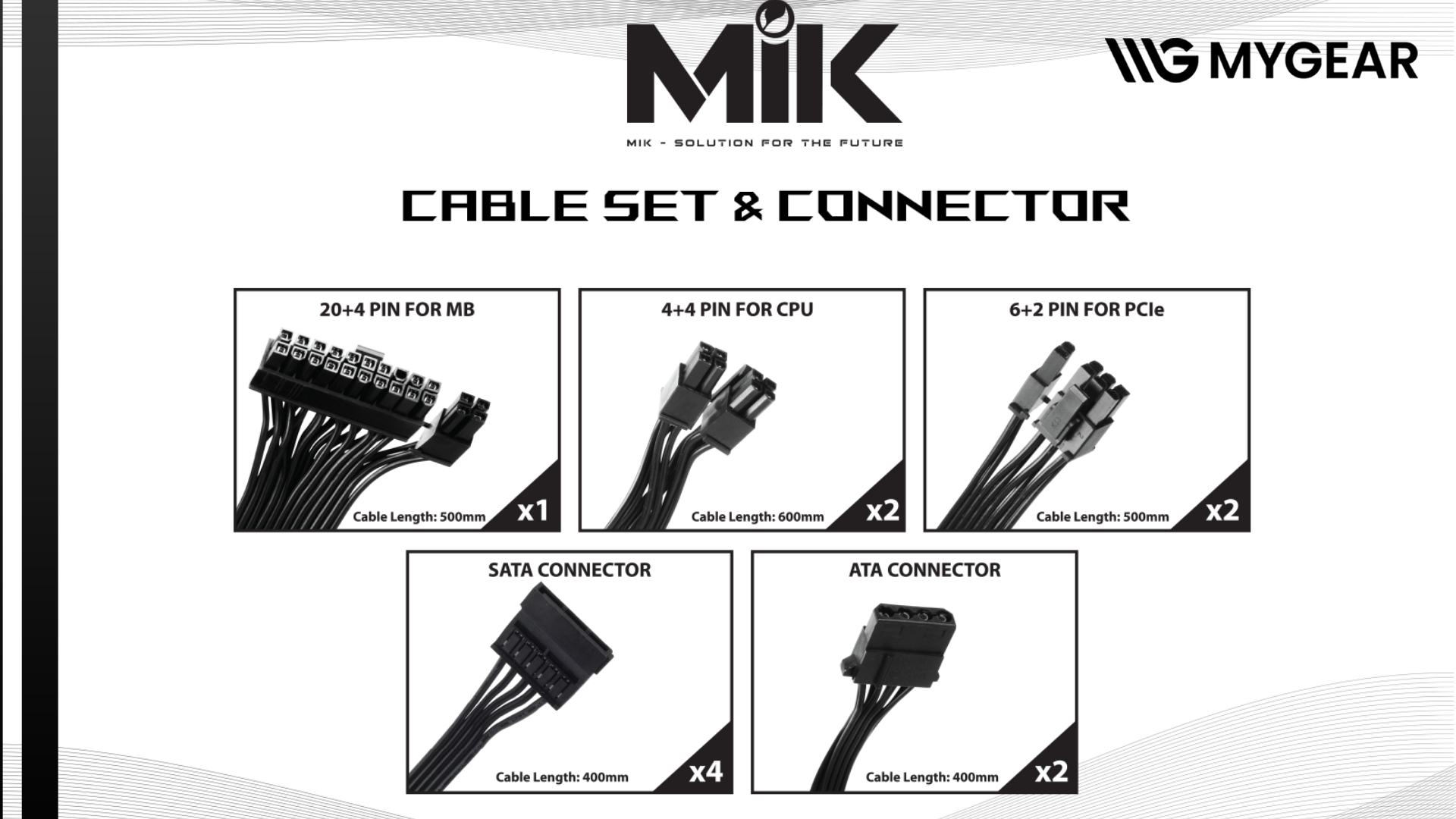 Nguồn trang bị đầu cấp chính gồm 1 đầu ATX 24Pin và 1 đầu CPU 4+4PIN đảm bảo cấp điện cho CPU và mainboard ổn định. Đầu cấp PCIe 8PIN x2 giúp PSU đáp ứng các card đồ họa tầm trung. Các đầu SATA 4 cổng và ATA 2 cổng hỗ trợ đầy đủ thiết bị lưu trữ và quạt điều hòa trong hệ thống. Với hệ thống cấp điện đa dạng, PSU MIK 650W ATX đáp ứng dễ dàng nhu cầu cấp điện cho build PC gaming hoặc máy tính làm việc đa nhiệm.
