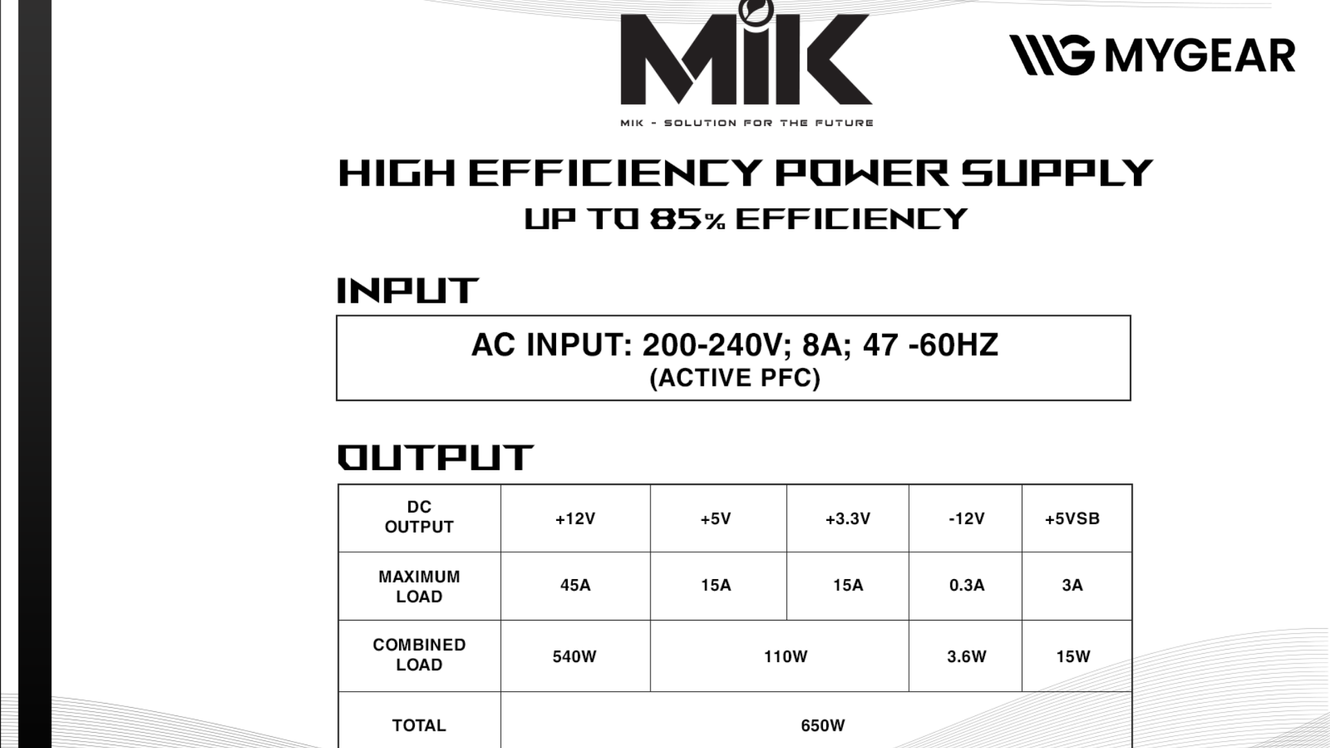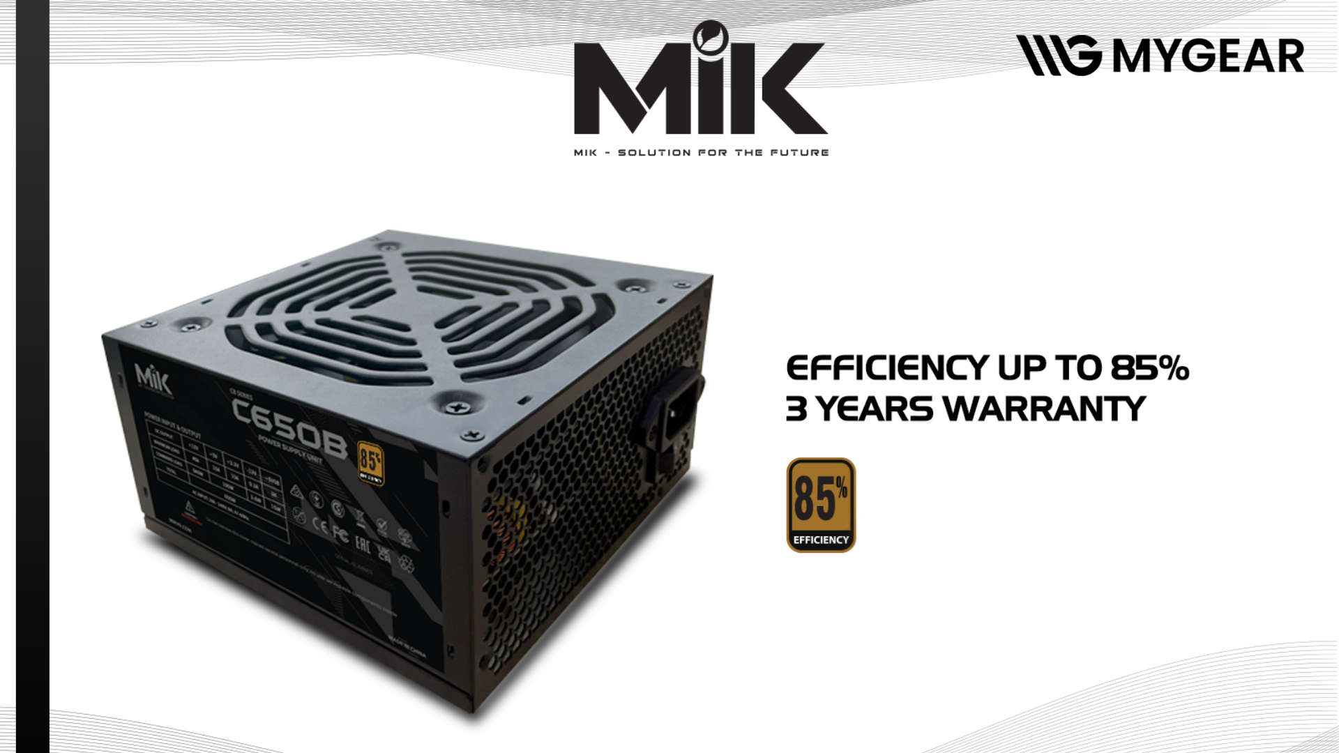 Nguồn máy tính MIK 85% efficiency đạt chứng chỉ 80 PLUS Bronze, giúp PSU chuyển đổi điện năng hiệu quả hơn, giảm hao phí nhiệt và tiêu thụ điện. Điểm này không chỉ giúp giảm tiền điện hàng tháng mà còn góp phần kéo dài tuổi thọ linh kiện do nguồn vận hành mát hơn và ổn định hơn. Với mức hiệu suất như vậy, MIK C650B là lựa chọn hợp lý cho những ai muốn một PSU 650W ATX bền bỉ mà không quá tốn kém.