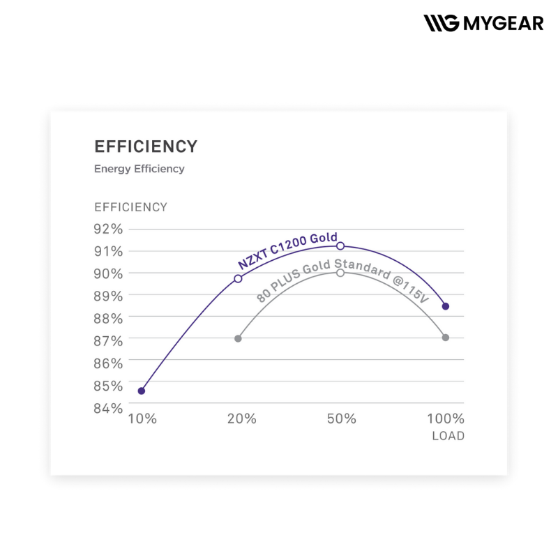 Nguồn máy tính NZXT C1200 Gold đạt chứng nhận 80 Plus Gold, mang lại hiệu suất chuyển đổi năng lượng lên tới 92% ở mức tải 50%. Điều này không chỉ giúp tiết kiệm điện năng, mà còn giảm lượng nhiệt tỏa ra, kéo dài tuổi thọ cho toàn bộ hệ thống.
