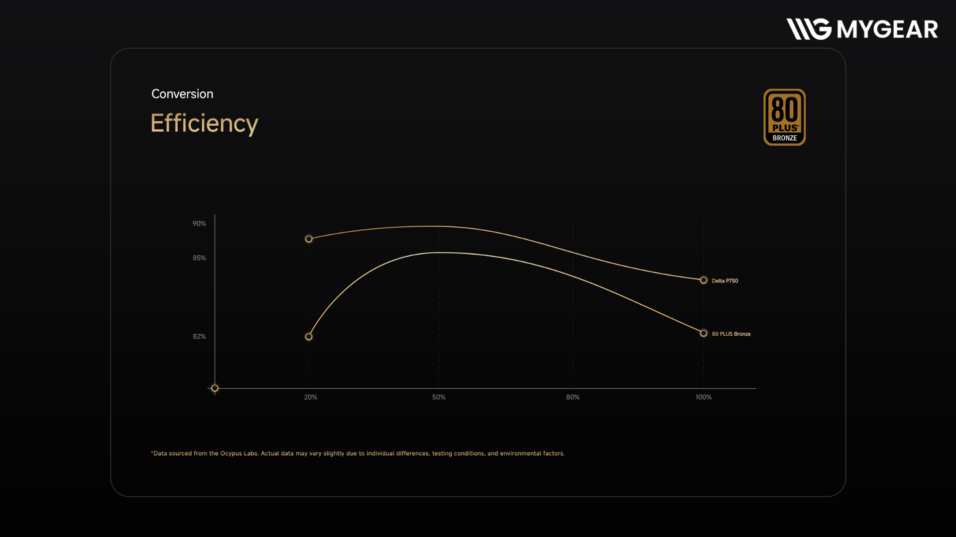 Được cấp chứng nhận 80 Plus Bronze, Ocypus Delta P750 BK đạt hiệu suất trên 87% ở tải trung bình. Điều này giúp giảm hao phí điện năng, tiết kiệm chi phí lâu dài và hạn chế nhiệt lượng tỏa ra, mang đến sự ổn định cho toàn hệ thống.