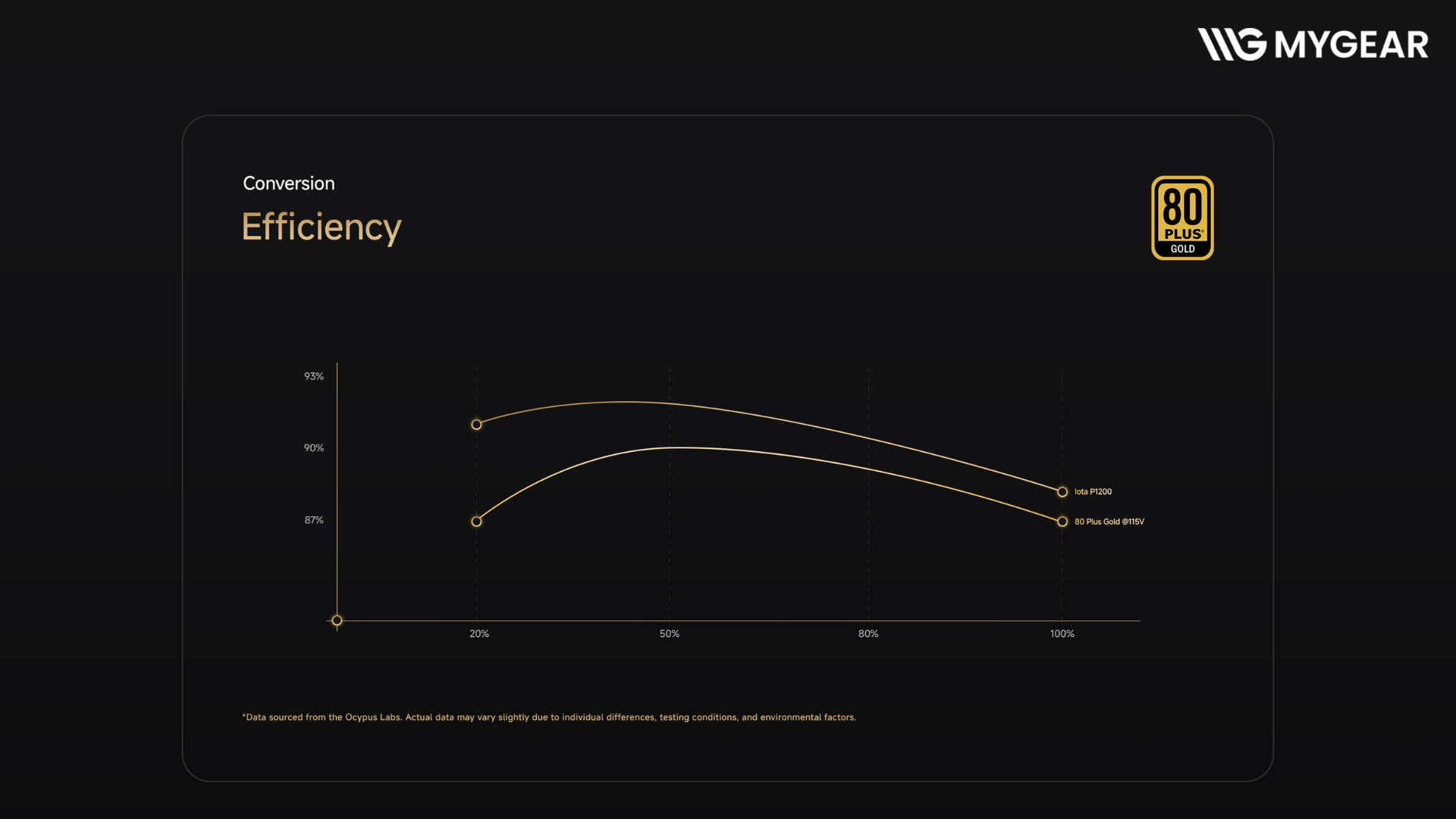 Ocypus 1200W 80 Plus Gold đạt hiệu suất chuyển đổi điện năng trên 91% ở tải điển hình, giảm thất thoát nhiệt và tiết kiệm điện năng. Điều này đồng nghĩa với việc hệ thống mát hơn, ổn định hơn và giúp giảm chi phí vận hành lâu dài.