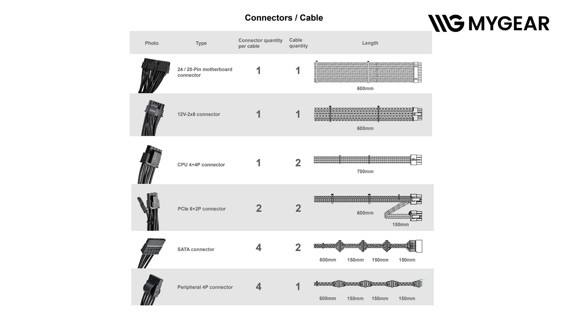 | Số lượng đầu nối | 1 x 24-Pin, 2 x 8/4-Pin EPS, 1 x 12V-2x6 (Gen5), 4 x 8/6-Pin PCIe, 8 x SATA, 4 x 4-Pin Peripheral |