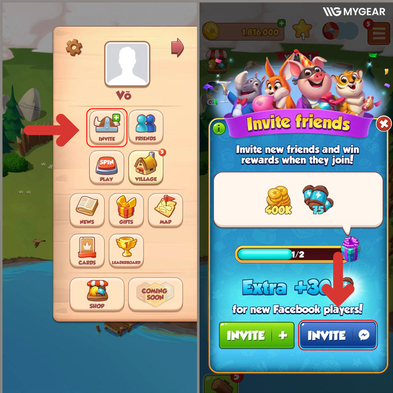 Bước 1: Vào màn hình chính Coin Master → chọn Invite Friends with Messenger