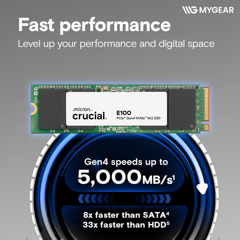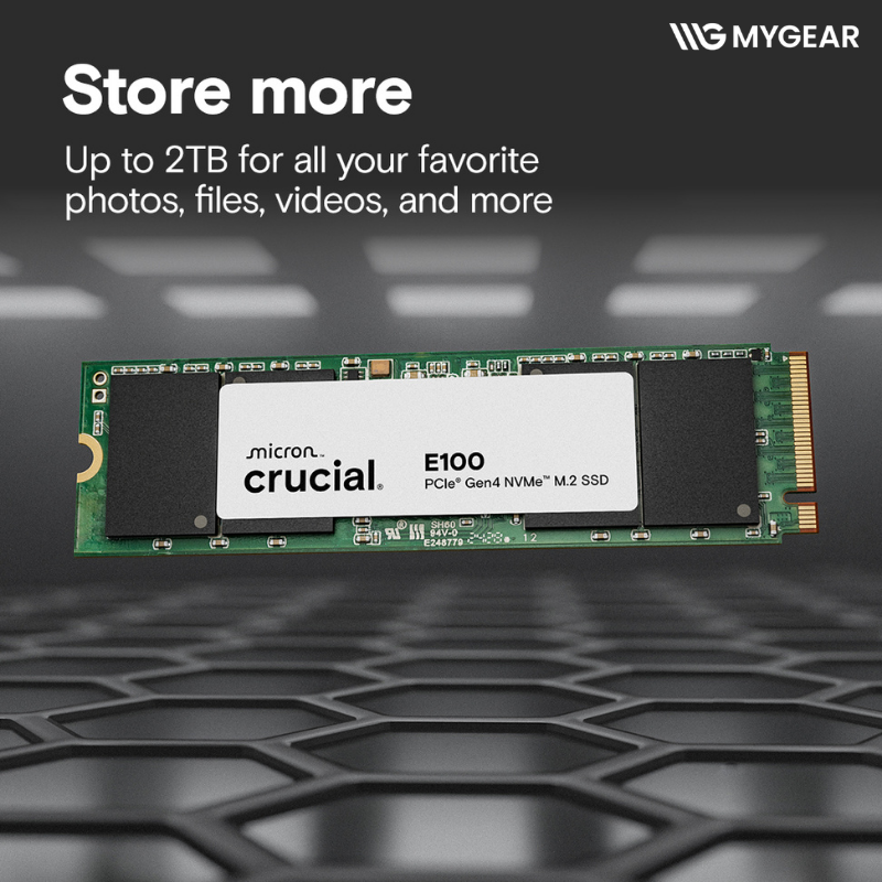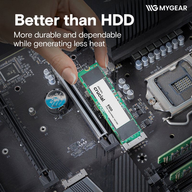 Với mức giá hợp lý, hiệu năng Gen4 và khả năng tương thích rộng, CT1000E100SSD8 là lựa chọn phù hợp cho người dùng nâng cấp PC gaming hoặc máy làm việc. Khi mua tại MYGEAR, SSD Crucial E100 có thể kết hợp hoàn hảo với mainboard B550, B650, Z690, Z790, RAM DDR4 hoặc DDR5 và CPU Intel hoặc AMD đang có sẵn, giúp tối ưu hiệu năng tổng thể của hệ thống.