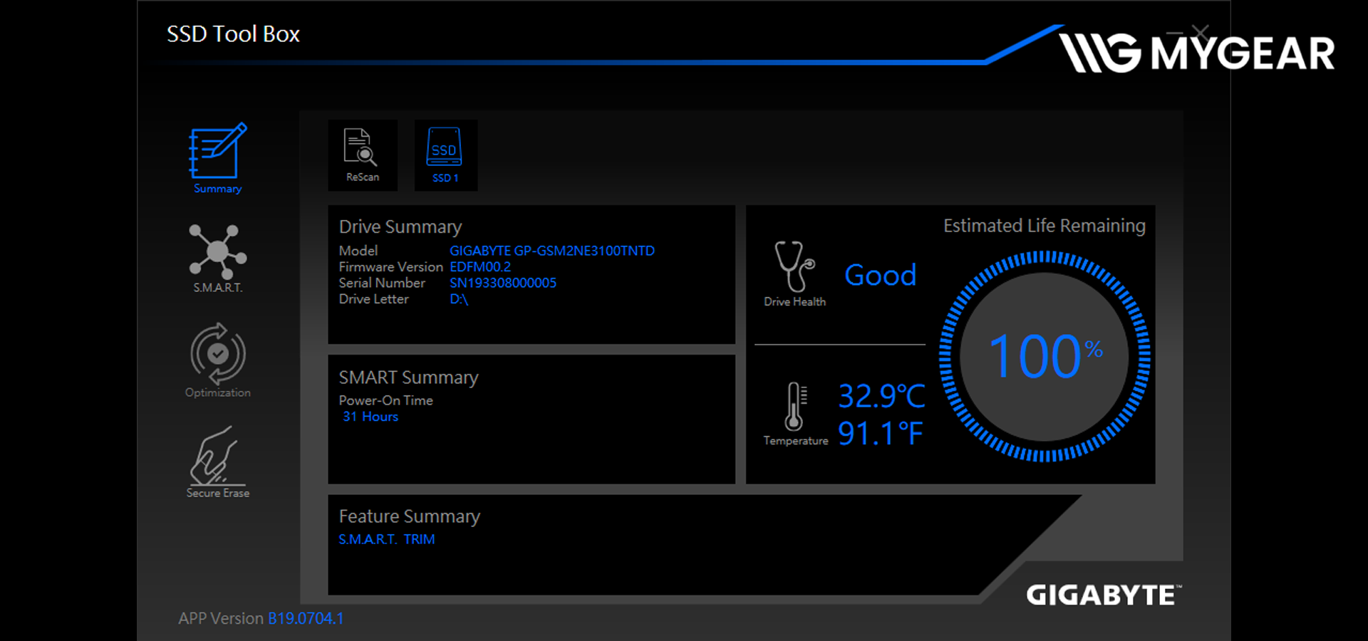 Một ưu điểm khác của Gigabyte Gen4 4000E 500GB chính là người dùng có thể tải phần mềm SSD Tool Box do Gigabyte phát triển để quản lý và theo dõi tình trạng ổ cứng. Công cụ cho phép kiểm tra tình trạng sức khỏe (health status), dung lượng đã ghi, cập nhật firmware và tối ưu hiệu năng chỉ bằng vài cú click. Đây là tính năng cực kỳ hữu ích giúp người dùng kiểm soát toàn diện hiệu suất SSD của mình, kéo dài tuổi thọ và đảm bảo an toàn dữ liệu.