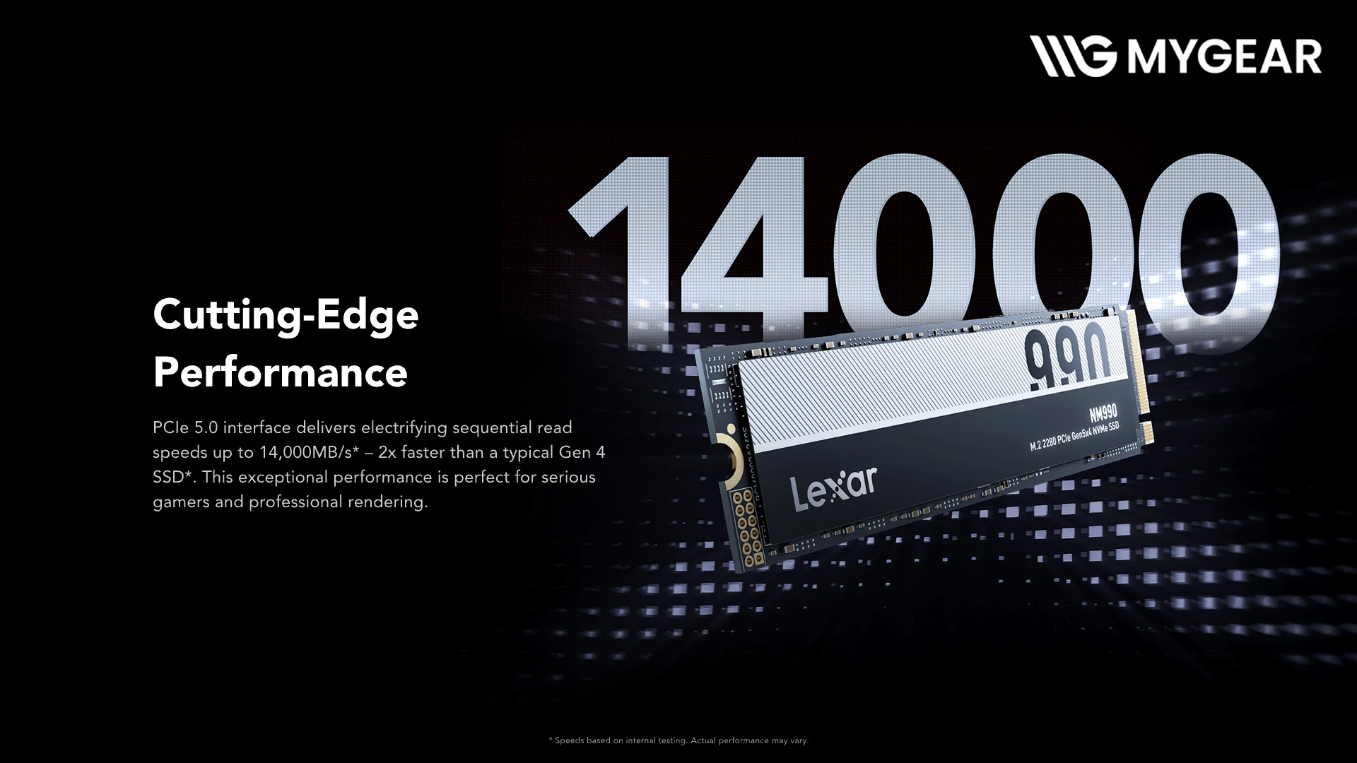 SSD Lexar NM990 1TB sử dụng chuẩn PCIe Gen5x4 NVMe, giúp tốc độ đọc tuần tự lên tới 14.000 MB/s, tốc độ ghi tuần tự 7.500 MB/s, gấp nhiều lần so với các SSD Gen4. Điều này đặc biệt hữu ích cho game thủ, editor dựng phim hoặc người dùng xử lý dữ liệu nặng, khi mà mỗi giây đọc/ghi đều quan trọng.