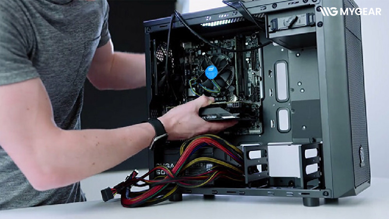 - Gắn SSD/HDD và card đồ họa: Nếu dùng SSD NVMe, gắn trực tiếp vào khe M.2. Card đồ họa cần cố định vào khe PCIe và vặn ốc chắc chắn.