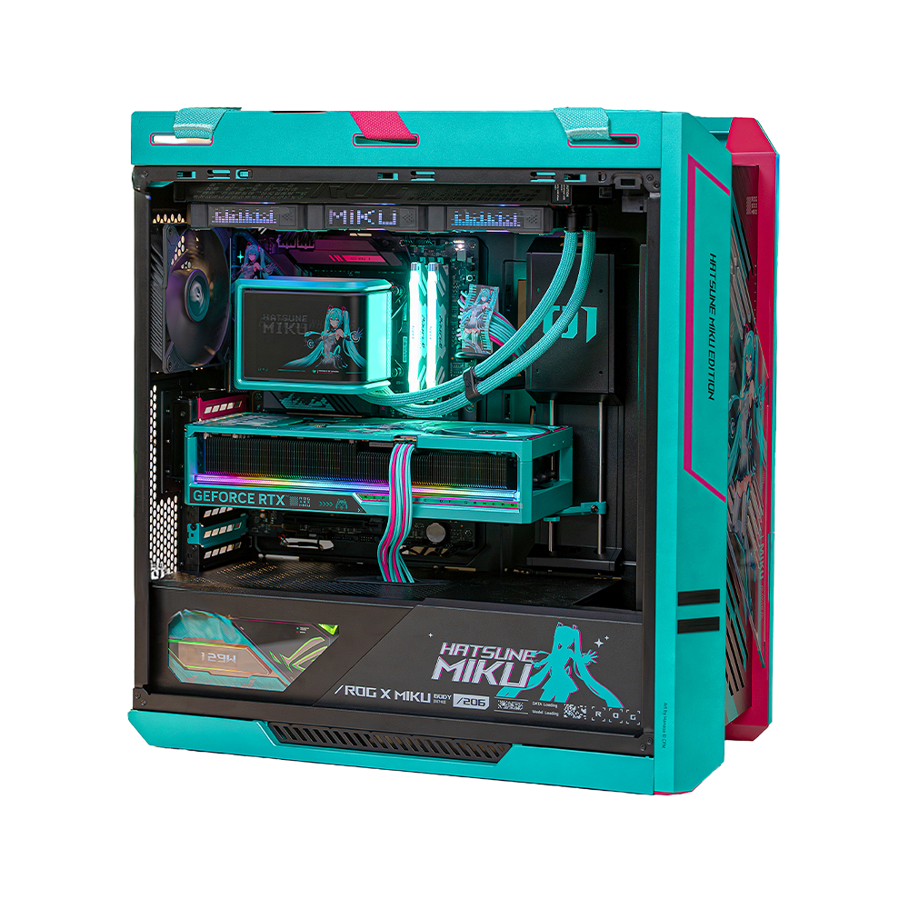 Hệ thống PC gaming ASUS ROG Hatsune Miku được hoàn thiện trong case ROG Strix Helios II Hatsune Miku Edition, đi kèm nguồn ROG THOR 1200W Platinum III Hatsune Miku Edition và tản nhiệt ROG RYUO IV 360 ARGB Hatsune Miku Edition, mang đến hiệu năng và thẩm mỹ đồng bộ.