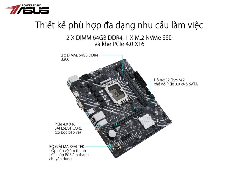 PC Intel i5 12400F ASUS được trang bị bo mạch chủ Intel đến từ ASUS, thương hiệu nổi tiếng về độ bền và khả năng tương thích cao. Bo mạch chủ giúp tối ưu hiệu suất của CPU, RAM và GPU, đồng thời đảm bảo hệ thống vận hành ổn định lâu dài. Hệ thống còn hỗ trợ nhiều cổng kết nối hiện đại như USB 3.2, HDMI, LAN tốc độ cao và khe M.2 NVMe cho SSD, mang đến sự tiện lợi tối đa cho người dùng.