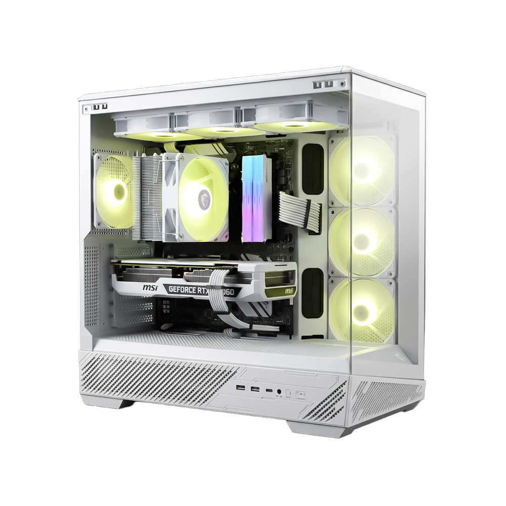 Điểm nhấn của PC MSI Ventus White nằm ở ngoại hình sang trọng tone trắng chủ đạo, case kính cường lực trong suốt, đèn ARGB nhẹ nhàng, cùng khả năng hỗ trợ radiator 360mm ở mặt trước và GPU dài tới 400mm. Luồng gió mát mẻ, bố cục thoáng, giúp toàn bộ linh kiện tỏa sáng bên trong, hoàn hảo cho những ai yêu thích build PC gaming MSI white phong cách sang trọng.